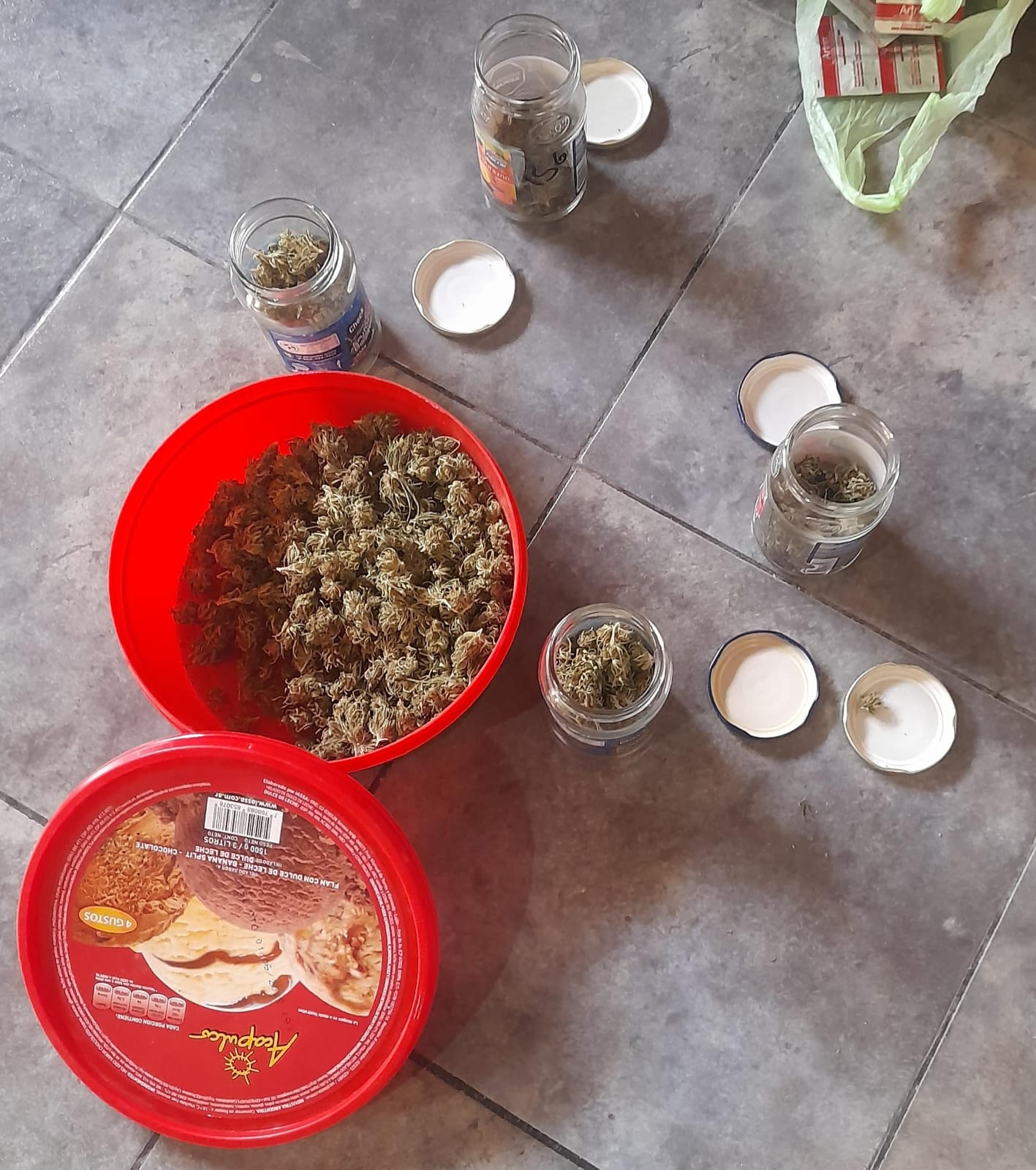 Durante la requisa, el personal policial halló un arma de fuego tipo revólver calibre 32 con cuatro cartuchos en su tambor, además de una sustancia vegetal, tres plantines con características similares a la planta de cannabis sativa.
