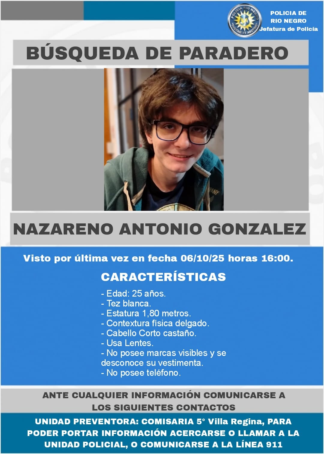 La Policía de Río Negro solicita la colaboración de la comunidad para dar con el paradero de Nazareno Antonio González, de 25 años, quien fue visto por última vez el 06 de octubre de 2025 a las 16:00 horas.