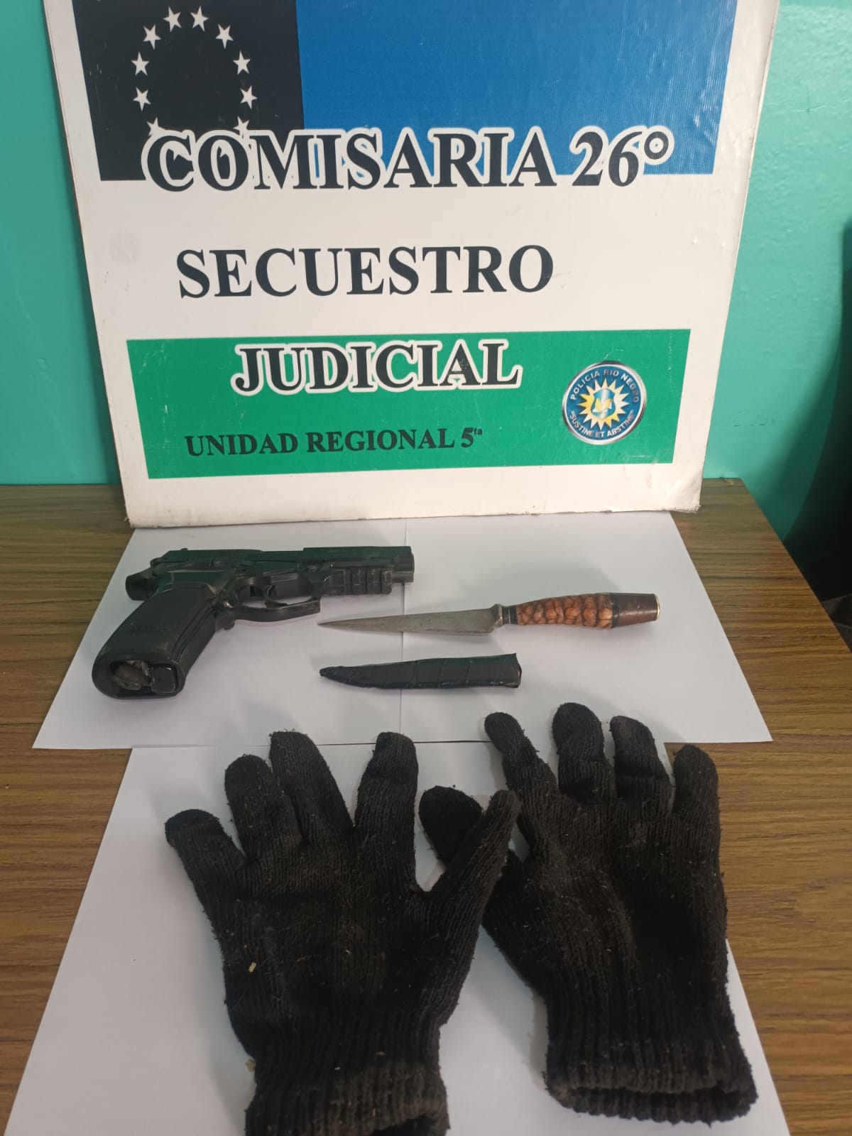 Durante el procedimiento, uno de los sujetos portaba una réplica de arma de fuego tipo pistola junto con un cargador y tubo de gas, mientras que el otro tenía entre sus prendas un cuchillo tipo trinchera. Ambos fueron trasladados a la Comisaría 26º en calidad de demorados, con el fin de proceder a su correcta identificación.