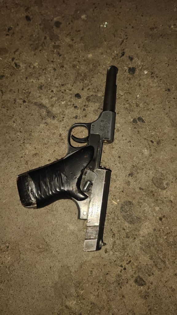 Durante el rastrillaje, el personal encontró un arma de fuego tipo pistola calibre 22, color negra brillante, con un cartucho completo listo para el disparo, sin almacén cargador y con empuñadura envuelta en cinta aisladora.