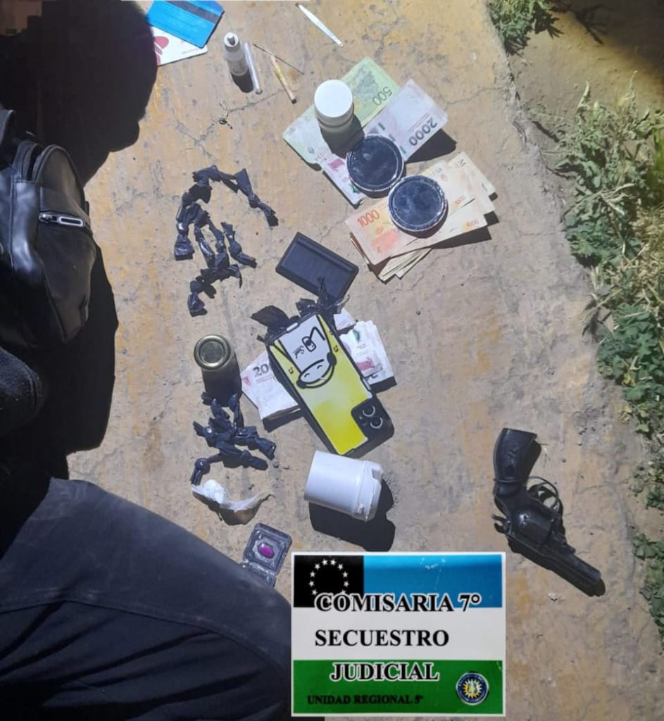Durante el procedimiento, el sujeto intentó evadir el accionar policial, pero fue rápidamente reducido y esposado. En presencia de testigos y bajo filmación, se verificó que el revólver —marca Pasper, calibre 22, con número de serie suprimido— contenía ocho municiones. Además, dentro de una riñonera se hallaron varios envoltorios con sustancia blanca en polvo, un frasco con sustancia vegetal similar a marihuana y una suma de 37.500 pesos en efectivo.