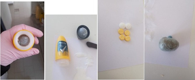 Durante la revisión, la oficial de guardia detectó que un desodorante a bolilla presentaba irregularidades. Al retirar la bolilla para inspeccionar el interior, se halló un envoltorio de color celeste con sustancia similar a cannabis sativa. Al continuar la verificación, se constató que dentro del mismo envase había otro envoltorio de iguales características que contenía pastillas de color amarillo y blanco.