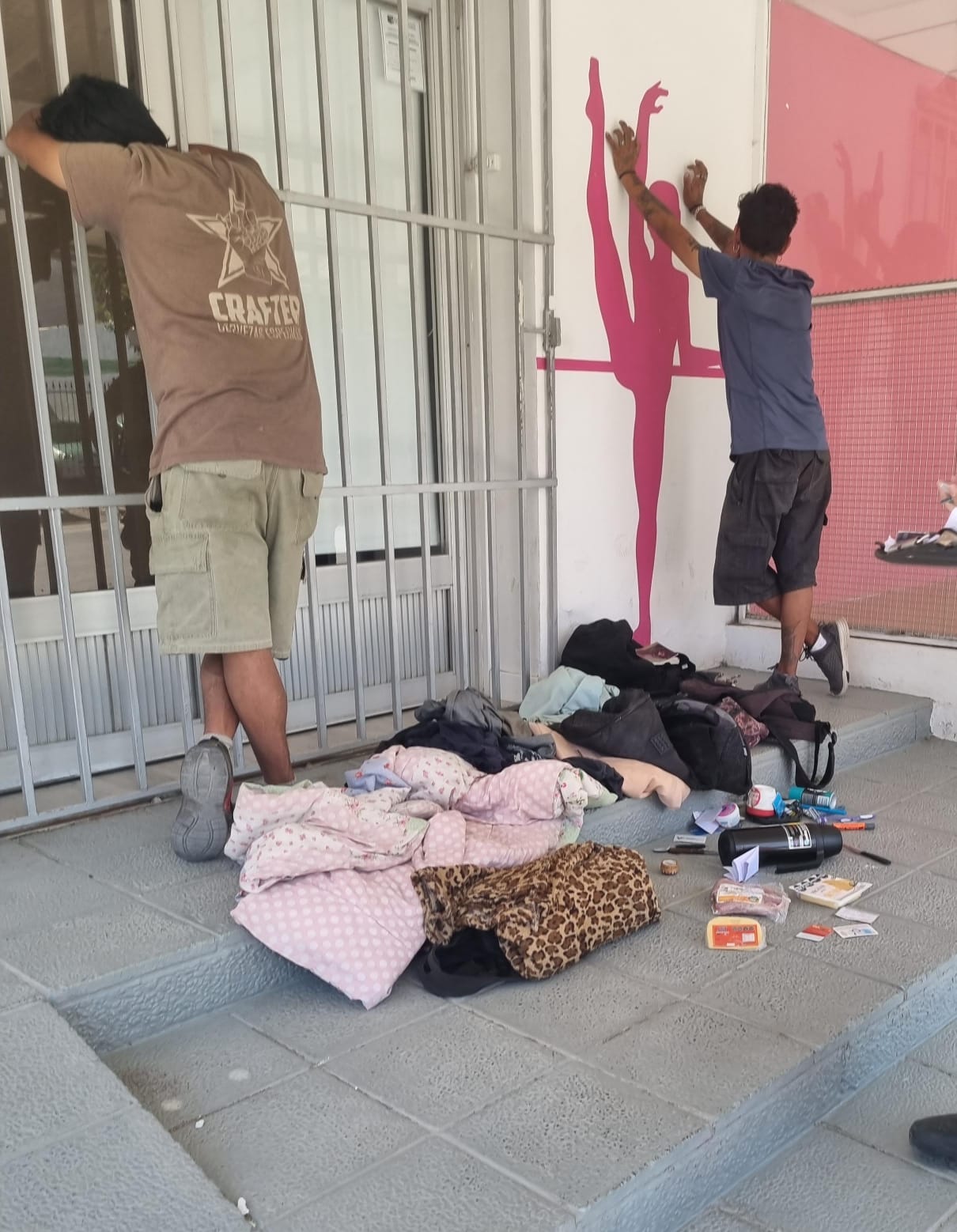 La intervención comenzó cuando un empleado del comercio alertó a la policía sobre dos sujetos vestidos con ropa oscura y pantalón corto que se habían llevado productos cárnicos y se dirigían hacia la terminal de ómnibus.
