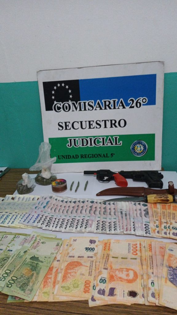 Al arribar al lugar, los efectivos divisaron a dos hombres cuyas características coincidían con las informadas, ambos portando mochilas. Durante el procedimiento se incautaron cigarrillos con sustancia vegetal símil marihuana, una réplica de arma de fuego tipo revólver y, en el caso del segundo sujeto, dos envoltorios con sustancia vegetal, un picador metálico, una importante suma de dinero, un cuchillo y otra réplica de arma tipo pistola.