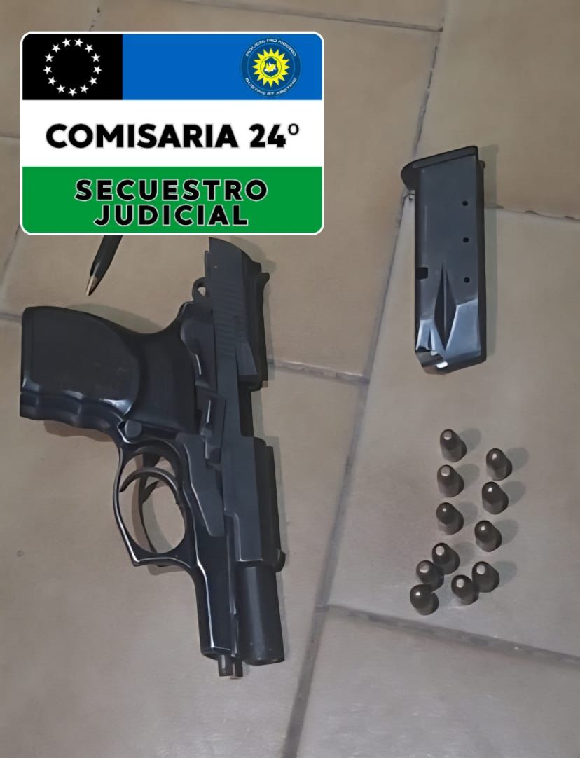 Durante un rastrillaje por la zona, los uniformados observaron a dos sujetos con las características aportadas, quienes al advertir la presencia policial emprendieron la huida a pie. Luego de una breve persecución, uno de ellos fue alcanzado y reducido en calle Chile y Jorge Newbery, oponiendo resistencia al procedimiento. Al ser trasladado a la unidad para su identificación, se constató que portaba un arma de fuego calibre 9 milímetros con numeración limada y un cargador con once municiones.