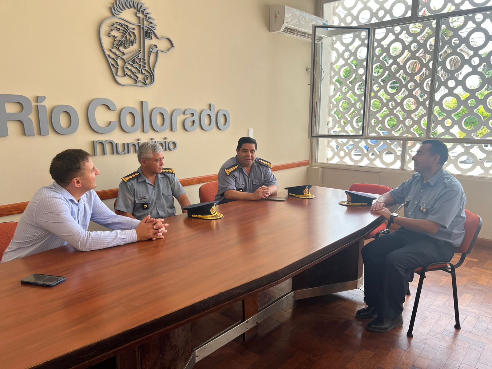 Del encuentro también formaron parte el jefe de la Unidad Regional IV, Juan Carlos Bautista, y el intendente de Río Colorado, Duilio Minieri, donde se abordaron distintos aspectos vinculados a la seguridad local.