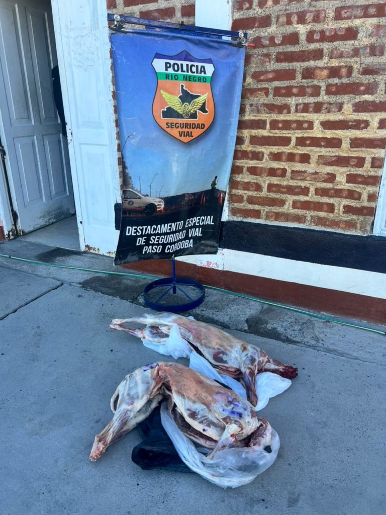 En Paso Córdoba, efectivos policiales detuvieron un vehículo Toyota Hiace, color blanco, que circulaba de Los Menucos hacia General Roca. El conductor de 48 años, transportaba bajo los asientos del vehículo dos ovinos faenados, sin cadena de frío ni documentación que acreditara su origen.